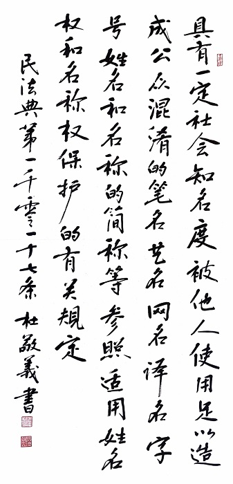 民法典第一千零一十七條 具有一定社會(huì)知名度,被他人使用足以造成公眾混淆的筆名、藝名、網(wǎng)名、譯名、字號(hào)、姓名和名稱(chēng)的簡(jiǎn)稱(chēng)等,參照適用姓名權(quán)和名稱(chēng)權(quán)保護(hù)的有關(guān)規(guī)定。