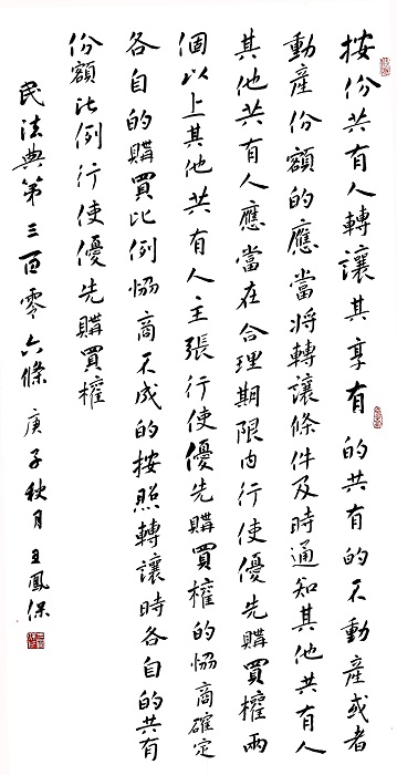民法典第三百零六條 按份共有人轉(zhuǎn)讓其享有的共有的不動產(chǎn)或者動產(chǎn)份額的,應(yīng)當(dāng)將轉(zhuǎn)讓條件及時通知其他共有人。其他共有人應(yīng)當(dāng)在合理期限內(nèi)行使優(yōu)先購買權(quán)。