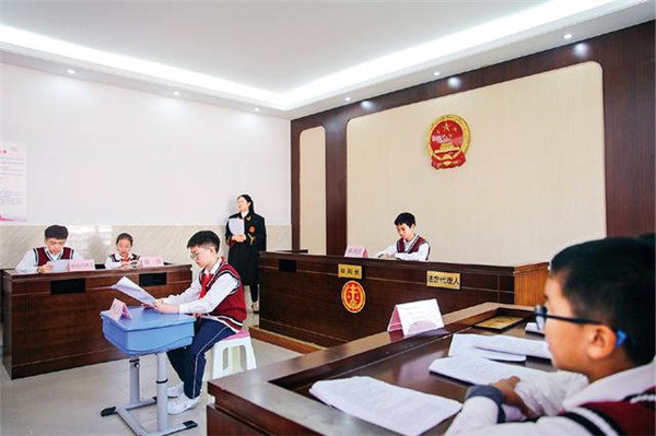 2020年10月30日,安徽省合肥市濱湖世紀社區(qū)在合肥師范附小三小開展“模擬法庭進校園”活動。圖為當日拍攝的模擬法庭“庭審”現場。新華社記者 曹力/攝