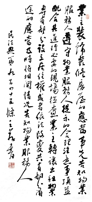 民法典第九百四十五條 業(yè)主裝飾裝修房屋的,應(yīng)當(dāng)事先告知物業(yè)服務(wù)人,遵守物業(yè)服務(wù)人提示的合理注意事項,并配合其進(jìn)行必要的現(xiàn)場檢查。