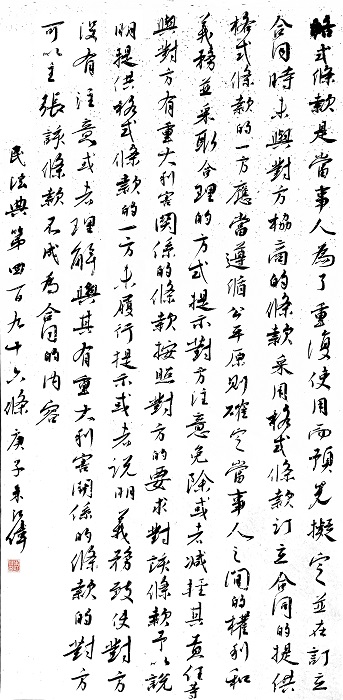 民法典第四百九十六條 格式條款是當(dāng)事人為了重復(fù)使用而預(yù)先擬定,并在訂立合同時未與對方協(xié)商的條款。