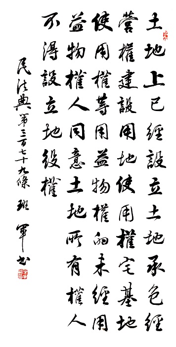 民法典第三百七十九條 土地上已經(jīng)設(shè)立土地承包經(jīng)營權(quán)、建設(shè)用地使用權(quán)、宅基地使用權(quán)等用益物權(quán)的,未經(jīng)用益物權(quán)人同意,土地所有權(quán)人不得設(shè)立地役權(quán)。
