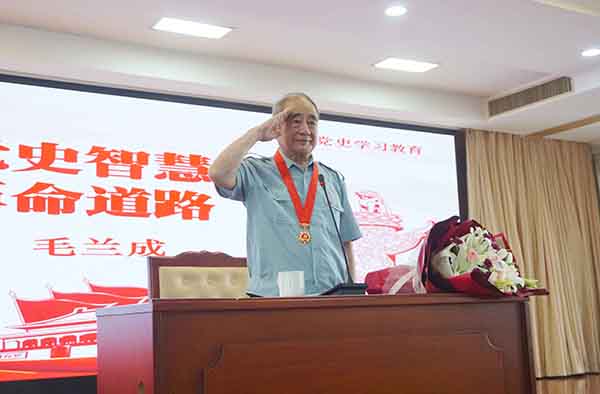 銘記革命歷史,傳承紅色基因?!爸袊萌恕?、空軍老戰(zhàn)士報告團、洪山區(qū)“五老”報告團團長毛蘭成在大會上以《汲取黨史智慧 走好革命道路》為題為全體黨員作報告。