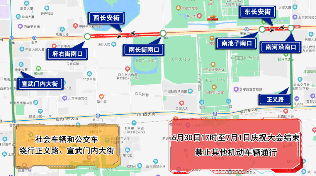 6月30日17時至7月1日慶祝大會結(jié)束,西長安街由府右街南口(不含)至南長街南口(不含)、東長安街由南河沿南口(不含)至南池子南口(不含)雙方向路段,除持有慶祝大會專用證件的車輛外,禁止其他機動車輛通行。社會車輛和公交車經(jīng)正義路、宣武門內(nèi)大街繞行。