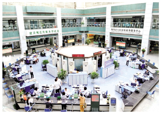 2013年,國(guó)務(wù)院決定先行取消和下放91項(xiàng)行政審批事項(xiàng),并要求各部門加大減少和下放行政審批事項(xiàng)工作力度,簡(jiǎn)政放權(quán)、放管結(jié)合、優(yōu)化服務(wù),簡(jiǎn)稱“放管服”改革。圖為四川省人民政府政務(wù)服務(wù)大廳。 法治日?qǐng)?bào)全媒體記者 楊晉峰 攝
