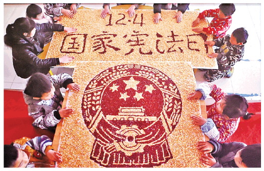 為了增強(qiáng)全社會(huì)的憲法意識(shí),弘揚(yáng)憲法精神,加強(qiáng)憲法實(shí)施,全面推進(jìn)依法治國(guó),2014年11月,全國(guó)人大常委會(huì)作出決定將12月4日設(shè)立為國(guó)家憲法日。圖為2014年12月,山東省沂源縣小朋友用玉米、紅小豆等作物制作出各種法治宣傳畫,迎接首個(gè)“國(guó)家憲法日”。 (資料圖片)