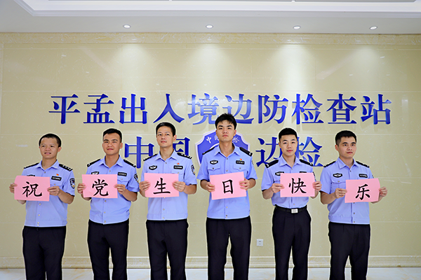 在平孟口岸樓前,民輔警職工整齊劃一擺出“100”的造型,深情回望黨的光輝歷程;在邊境界碑前,民輔警舉起右拳,向著黨旗,重溫入黨誓詞,立志傳承黨的紅色基因;在站機(jī)關(guān)樓前,民輔警手舉“熱烈慶祝中國共產(chǎn)黨成立100周年“橫幅,手搖小黨旗,洋溢著笑容,衷心祝福黨的光明前景;在辦公樓里,民輔警拿著“祝黨生日快樂”,“不忘初心 牢記使命”卡片,述說對黨的無限忠誠。