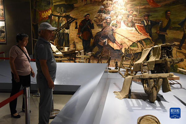 在位于山東省臨沂市蒙陰縣的孟良崮戰(zhàn)役紀(jì)念館,游客參觀孟良崮戰(zhàn)役期間使用過(guò)的小推車(2019年6月9日攝)。新華社記者 王凱 攝