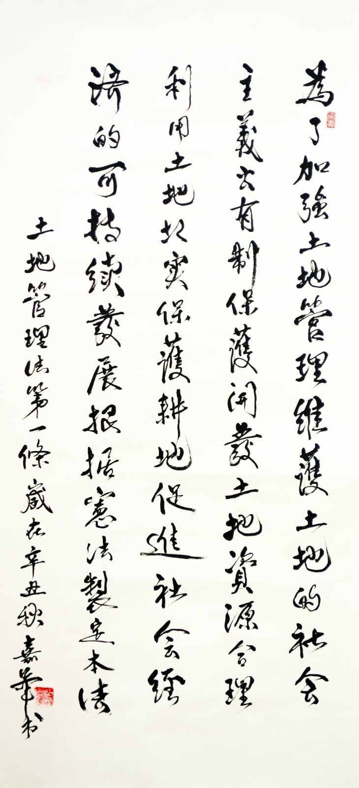 繼1600余位書法家參與書寫《中華人民共和國民法典》全部1260條法條之后,法治日報社聯(lián)合自然資源部法規(guī)司、自然資源部書畫研究會和北京昌平書法家協(xié)會,將筆端對準(zhǔn)土地管理“一法一條例”,即《中華人民共和國土地管理法》和《中華人民共和國土地管理法實施條例》。