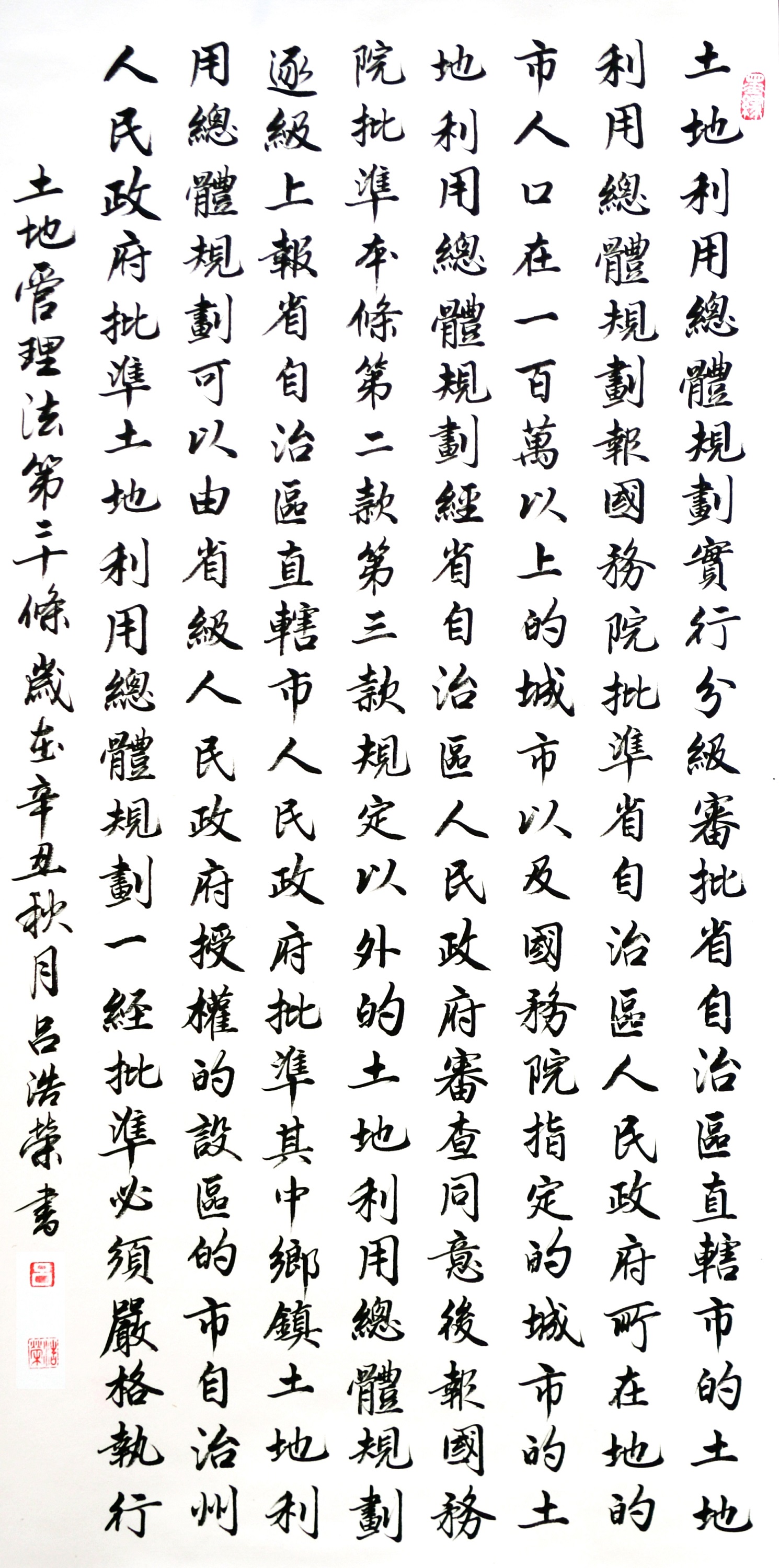 繼1600余位書(shū)法家參與書(shū)寫(xiě)《中華人民共和國(guó)民法典》全部1260條法條之后,法治日?qǐng)?bào)社聯(lián)合自然資源部法規(guī)司、自然資源部書(shū)畫(huà)研究會(huì)和北京昌平書(shū)法家協(xié)會(huì),將筆端對(duì)準(zhǔn)土地管理“一法一條例”,即《中華人民共和國(guó)土地管理法》和《中華人民共和國(guó)土地管理法實(shí)施條例》。