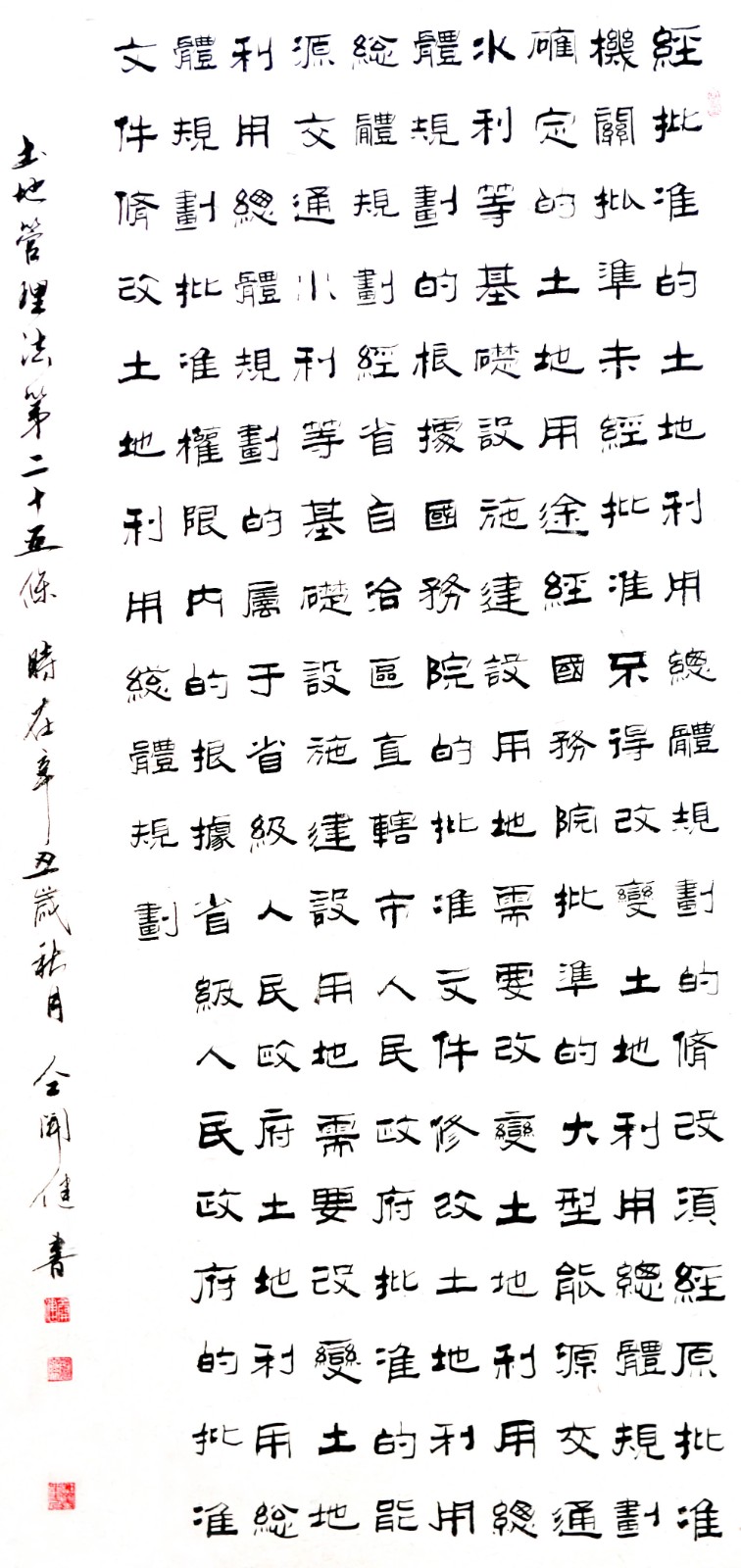 繼1600余位書法家參與書寫《中華人民共和國民法典》全部1260條法條之后,法治日報社聯(lián)合自然資源部法規(guī)司、自然資源部書畫研究會和北京昌平書法家協(xié)會,將筆端對準土地管理“一法一條例”,即《中華人民共和國土地管理法》和《中華人民共和國土地管理法實施條例》。