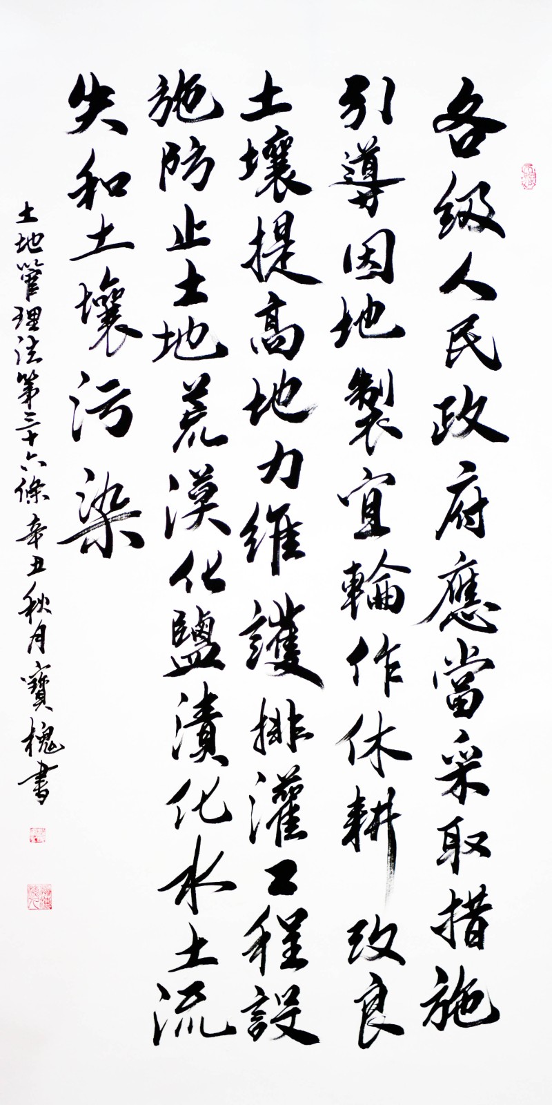 繼1600余位書法家參與書寫《中華人民共和國民法典》全部1260條法條之后,法治日?qǐng)?bào)社聯(lián)合自然資源部法規(guī)司、自然資源部書畫研究會(huì)和北京昌平書法家協(xié)會(huì),將筆端對(duì)準(zhǔn)土地管理“一法一條例”,即《中華人民共和國土地管理法》和《中華人民共和國土地管理法實(shí)施條例》。