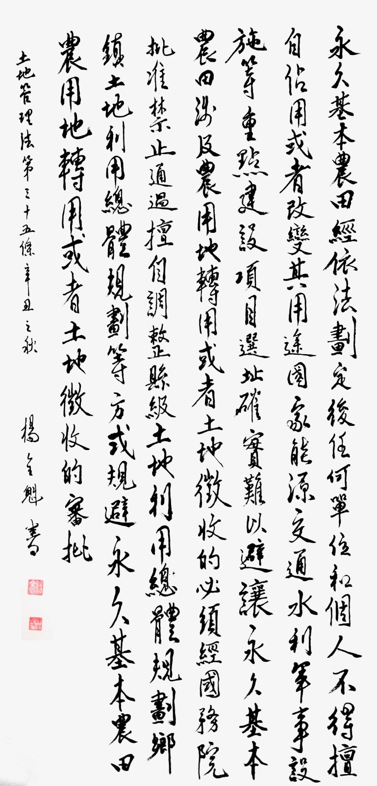 繼1600余位書法家參與書寫《中華人民共和國(guó)民法典》全部1260條法條之后,法治日?qǐng)?bào)社聯(lián)合自然資源部法規(guī)司、自然資源部書畫研究會(huì)和北京昌平書法家協(xié)會(huì),將筆端對(duì)準(zhǔn)土地管理“一法一條例”,即《中華人民共和國(guó)土地管理法》和《中華人民共和國(guó)土地管理法實(shí)施條例》。