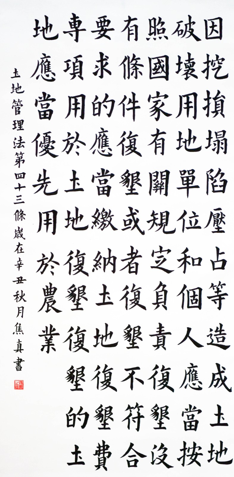 繼1600余位書法家參與書寫《中華人民共和國民法典》全部1260條法條之后,法治日報社聯(lián)合自然資源部法規(guī)司、自然資源部書畫研究會和北京昌平書法家協(xié)會,將筆端對準(zhǔn)土地管理“一法一條例”,即《中華人民共和國土地管理法》和《中華人民共和國土地管理法實施條例》。
