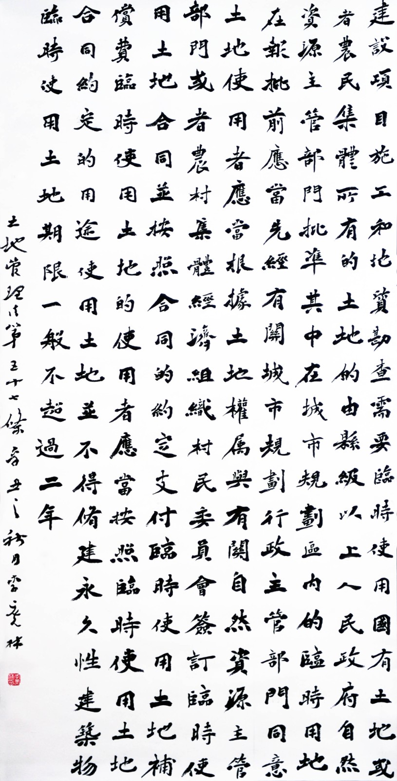 繼1600余位書法家參與書寫《中華人民共和國民法典》全部1260條法條之后,法治日報社聯(lián)合自然資源部法規(guī)司、自然資源部書畫研究會和北京昌平書法家協(xié)會,將筆端對準土地管理“一法一條例”,即《中華人民共和國土地管理法》和《中華人民共和國土地管理法實施條例》。