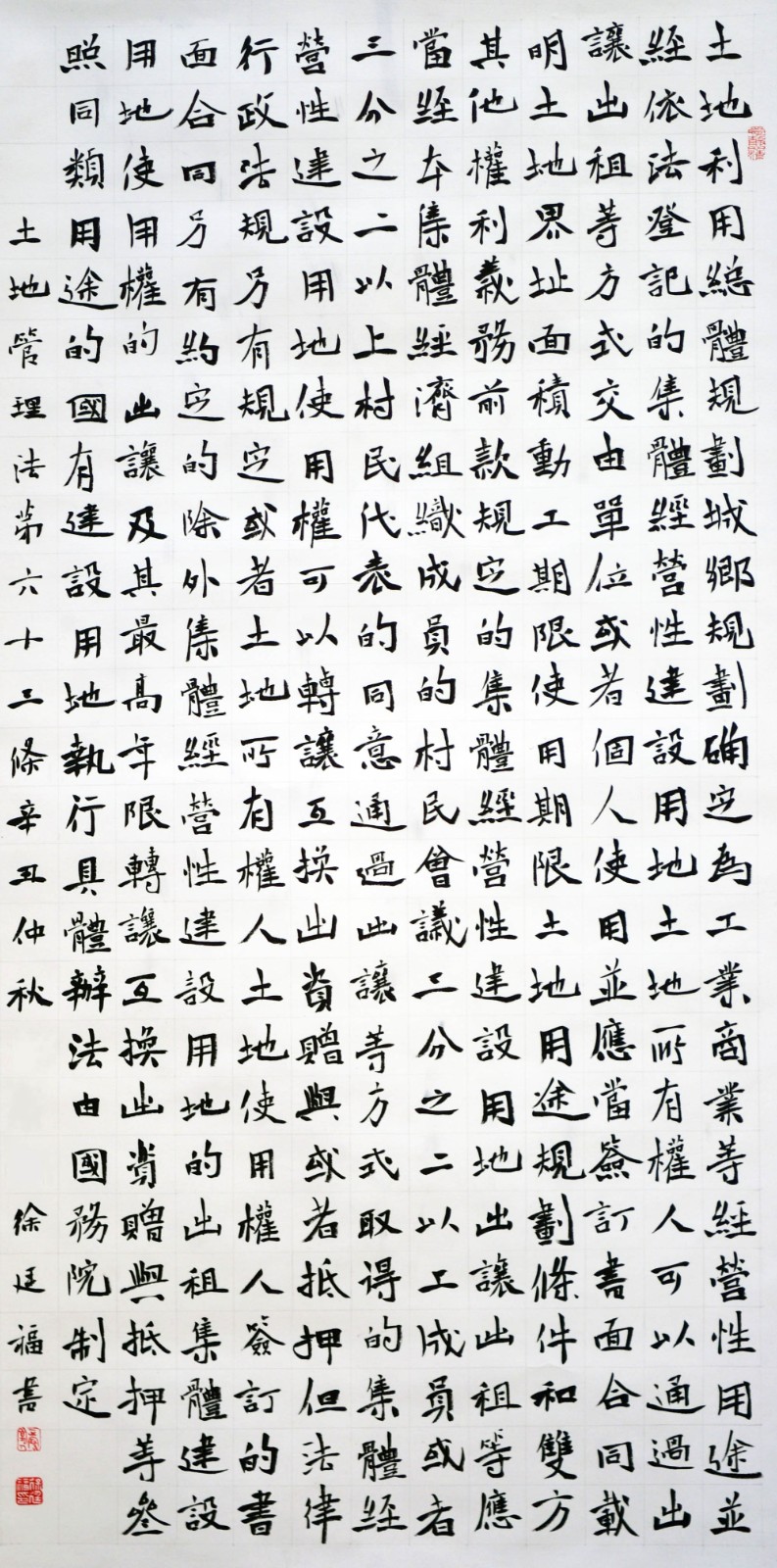 繼1600余位書法家參與書寫《中華人民共和國(guó)民法典》全部1260條法條之后,法治日?qǐng)?bào)社聯(lián)合自然資源部法規(guī)司、自然資源部書畫研究會(huì)和北京昌平書法家協(xié)會(huì),將筆端對(duì)準(zhǔn)土地管理“一法一條例”,即《中華人民共和國(guó)土地管理法》和《中華人民共和國(guó)土地管理法實(shí)施條例》。