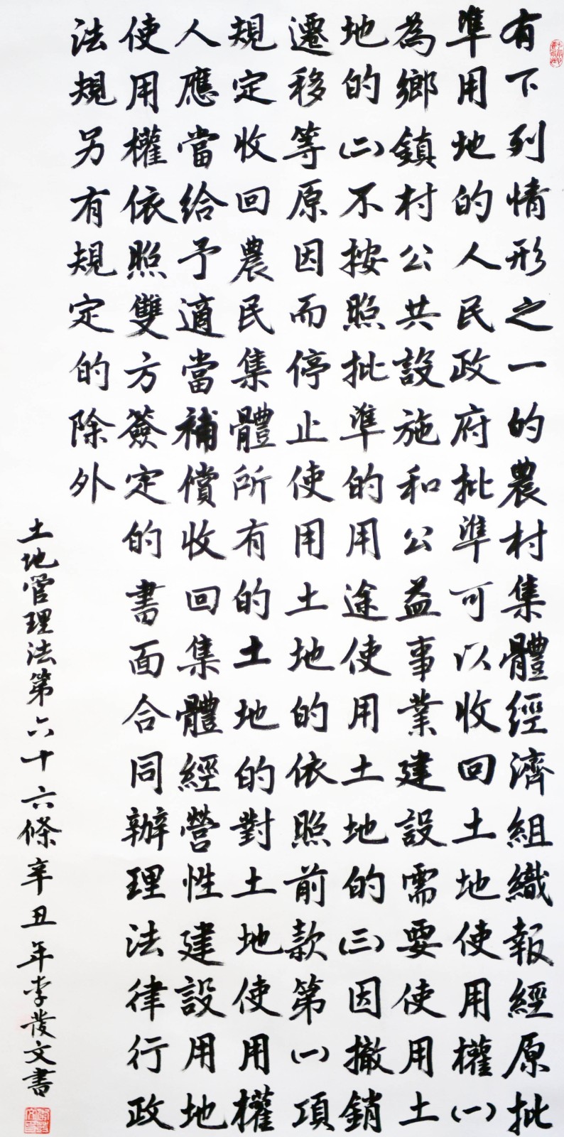 繼1600余位書法家參與書寫《中華人民共和國(guó)民法典》全部1260條法條之后,法治日?qǐng)?bào)社聯(lián)合自然資源部法規(guī)司、自然資源部書畫研究會(huì)和北京昌平書法家協(xié)會(huì),將筆端對(duì)準(zhǔn)土地管理“一法一條例”,即《中華人民共和國(guó)土地管理法》和《中華人民共和國(guó)土地管理法實(shí)施條例》。
