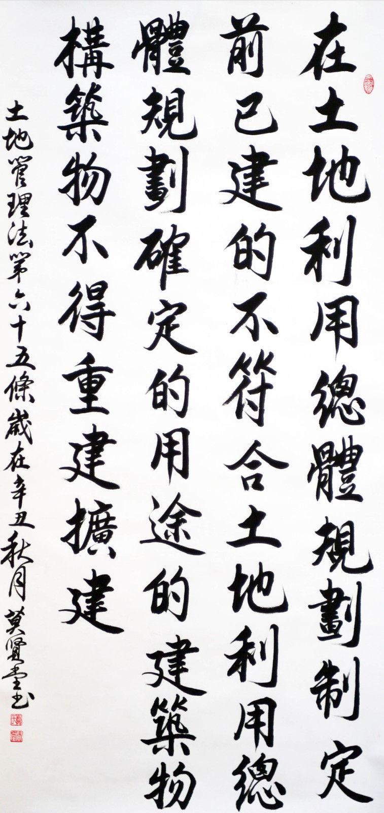 繼1600余位書法家參與書寫《中華人民共和國民法典》全部1260條法條之后,法治日報社聯(lián)合自然資源部法規(guī)司、自然資源部書畫研究會和北京昌平書法家協(xié)會,將筆端對準土地管理“一法一條例”,即《中華人民共和國土地管理法》和《中華人民共和國土地管理法實施條例》。