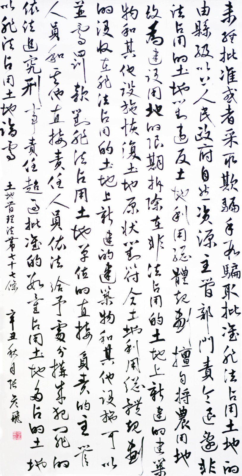 繼1600余位書法家參與書寫《中華人民共和國民法典》全部1260條法條之后,法治日報社聯(lián)合自然資源部法規(guī)司、自然資源部書畫研究會和北京昌平書法家協(xié)會,將筆端對準(zhǔn)土地管理“一法一條例”,即《中華人民共和國土地管理法》和《中華人民共和國土地管理法實施條例》。