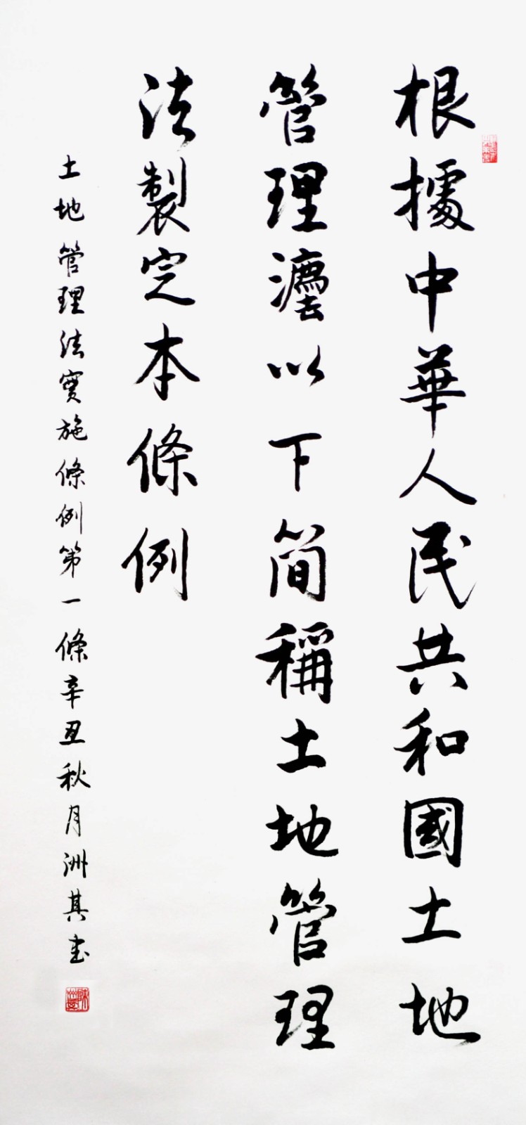 繼1600余位書法家參與書寫《中華人民共和國民法典》全部1260條法條之后,法治日?qǐng)?bào)社聯(lián)合自然資源部法規(guī)司、自然資源部書畫研究會(huì)和北京昌平書法家協(xié)會(huì),將筆端對(duì)準(zhǔn)土地管理“一法一條例”,即《中華人民共和國土地管理法》和《中華人民共和國土地管理法實(shí)施條例》。