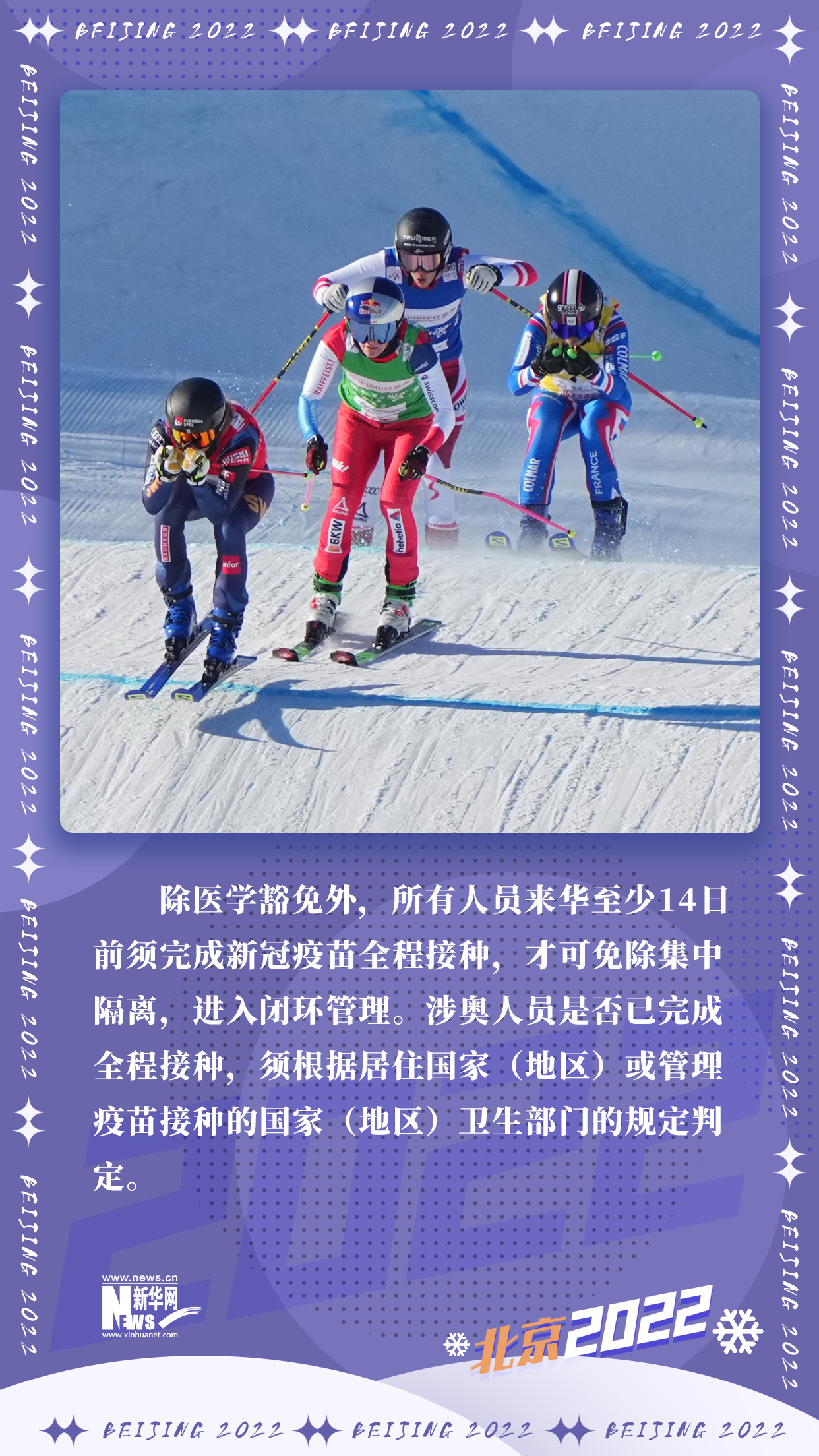 《北京2022年冬奧會和冬殘奧會防疫手冊》第二版日前發(fā)布。與10月發(fā)布的第一版相比,第二版就疫苗接種、海關(guān)入境要求、機(jī)票預(yù)訂、出發(fā)前檢測、冬奧賽時、閉環(huán)管理、住宿、交通、餐飲、核酸檢測、健康監(jiān)測、密接管理以及冬奧會和冬殘奧會轉(zhuǎn)換期等方面,提供了更加細(xì)化的信息。九條關(guān)鍵信息,帶你了解冬奧疫情防控2.0版。