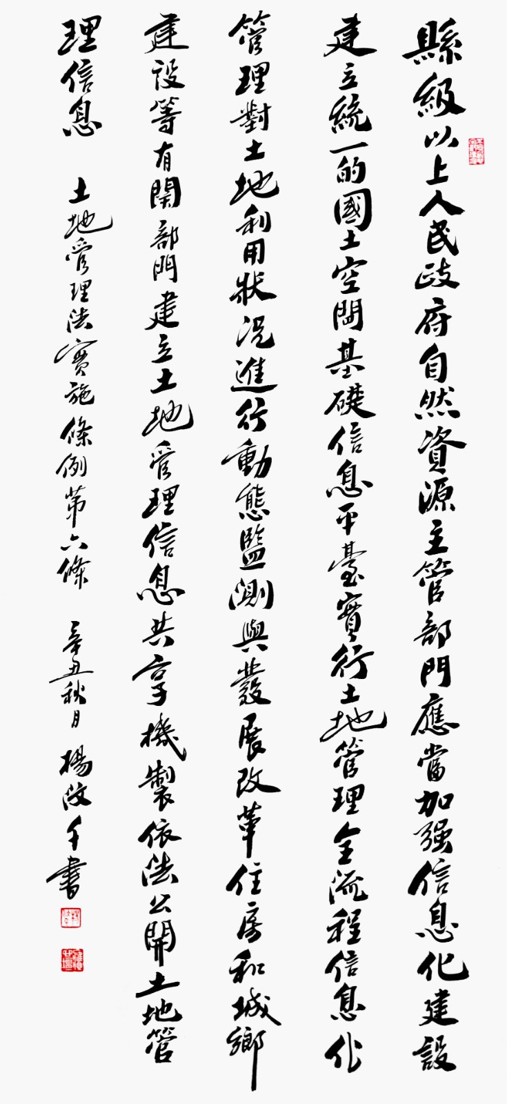 繼1600余位書法家參與書寫《中華人民共和國民法典》全部1260條法條之后,法治日報(bào)社聯(lián)合自然資源部法規(guī)司、自然資源部書畫研究會(huì)和北京昌平書法家協(xié)會(huì),將筆端對準(zhǔn)土地管理“一法一條例”,即《中華人民共和國土地管理法》和《中華人民共和國土地管理法實(shí)施條例》。