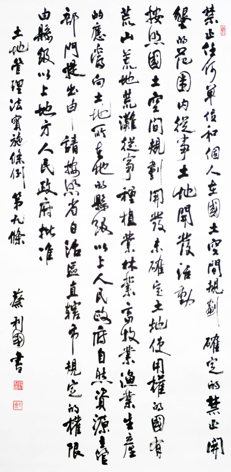 繼1600余位書法家參與書寫《中華人民共和國民法典》全部1260條法條之后,法治日?qǐng)?bào)社聯(lián)合自然資源部法規(guī)司、自然資源部書畫研究會(huì)和北京昌平書法家協(xié)會(huì),將筆端對(duì)準(zhǔn)土地管理“一法一條例”,即《中華人民共和國土地管理法》和《中華人民共和國土地管理法實(shí)施條例》。