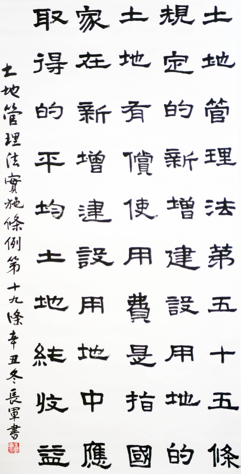 繼1600余位書法家參與書寫《中華人民共和國民法典》全部1260條法條之后,法治日?qǐng)?bào)社聯(lián)合自然資源部法規(guī)司、自然資源部書畫研究會(huì)和北京昌平書法家協(xié)會(huì),將筆端對(duì)準(zhǔn)土地管理“一法一條例”,即《中華人民共和國土地管理法》和《中華人民共和國土地管理法實(shí)施條例》。