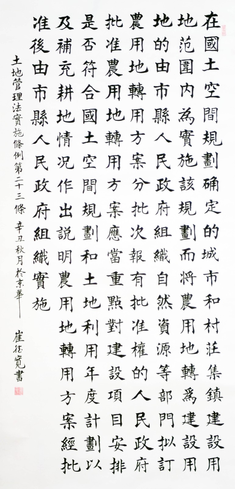 繼1600余位書法家參與書寫《中華人民共和國民法典》全部1260條法條之后,法治日報社聯(lián)合自然資源部法規(guī)司、自然資源部書畫研究會和北京昌平書法家協(xié)會,將筆端對準土地管理“一法一條例”,即《中華人民共和國土地管理法》和《中華人民共和國土地管理法實施條例》。