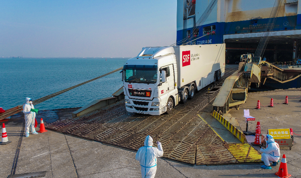 1月15日上午,載運(yùn)著6輛北京冬奧會(huì)轉(zhuǎn)播車(chē)的韓國(guó)籍“現(xiàn)代英勇”輪靠泊天津港。本票冬奧物資由天津出入境邊防檢查總站東港邊檢站完成快速入境查驗(yàn)后,將直接運(yùn)送至北京冬奧場(chǎng)館。