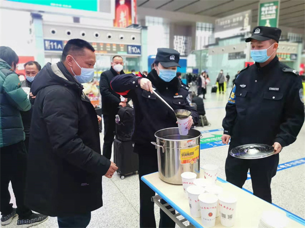 圖為合肥南站派出所民警為旅客送姜茶驅(qū)寒。