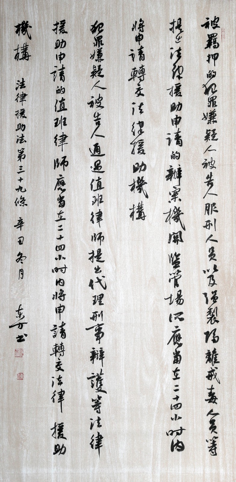 法律援助法第三十九條 被羈押的犯罪嫌疑人、被告人、服刑人員,以及強(qiáng)制隔離戒毒人員等提出法律援助申請的,辦案機(jī)關(guān)、監(jiān)管場所應(yīng)當(dāng)在二十四小時(shí)內(nèi)將申請轉(zhuǎn)交法律援助機(jī)構(gòu)。