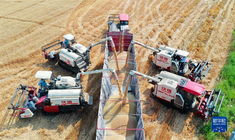 在合肥市蜀山區(qū)小廟鎮(zhèn)段沖村,收割機將小麥裝車,確保顆粒歸倉(2022年5月25日攝,無人機照片)。新華社發(fā)(陳三虎 攝)