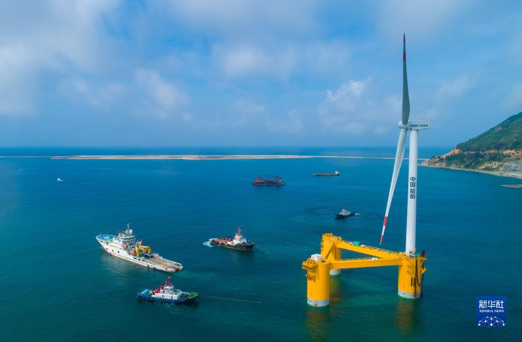 國內首臺深遠海浮式風電裝備“扶搖號”從廣東省茂名市廣港碼頭拖航前往羅斗沙海域進行示范應用(2022年5月29日攝,無人機照片)。新華社記者 劉大偉 攝