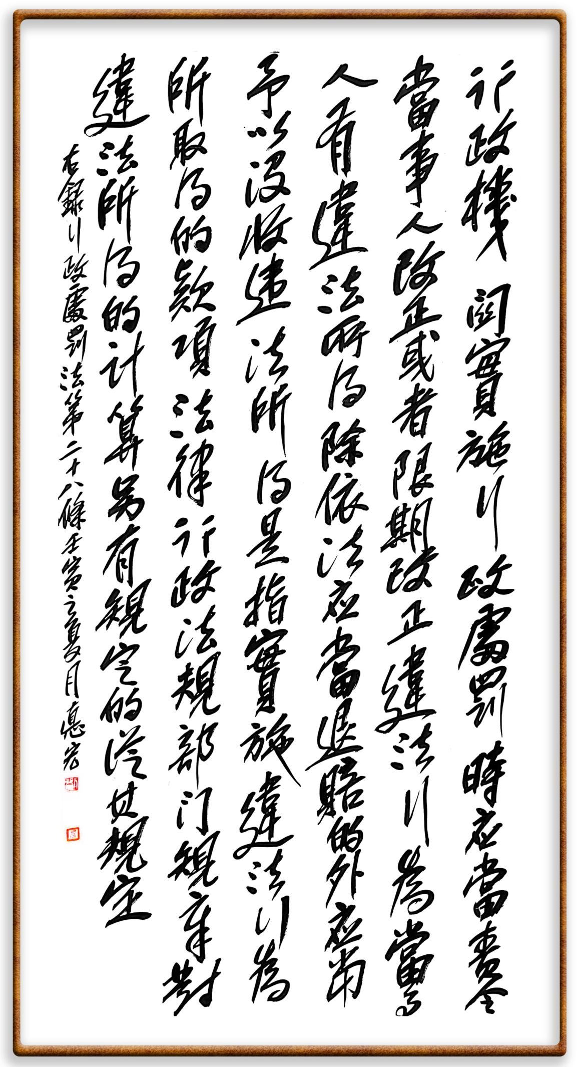 繼《中華人民共和國(guó)民法典》《中華人民共和國(guó)土地管理法》《中華人民共和國(guó)土地管理法實(shí)施條例》《中華人民共和國(guó)法律援助法》之后,法治日?qǐng)?bào)社聯(lián)合北京市司法局、北京市書(shū)法家協(xié)會(huì),將筆端對(duì)準(zhǔn)《中華人民共和國(guó)憲法》和《中華人民共和國(guó)行政處罰法》。