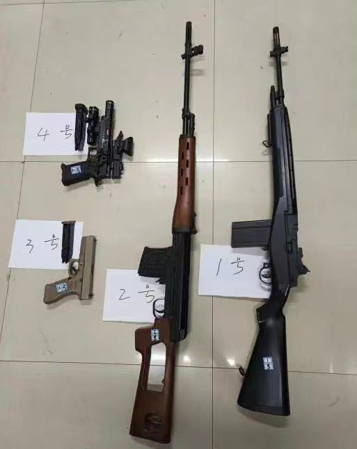 民警經(jīng)過細(xì)致研判及摸排走訪,最終鎖定犯罪嫌疑人為趙某某,并在鐵西區(qū)興順街南十二路附近某小區(qū)將其抓獲,當(dāng)場查獲仿真槍4支。后經(jīng)鑒定,其中2支以氣體為發(fā)射動力,認(rèn)定為槍支。
