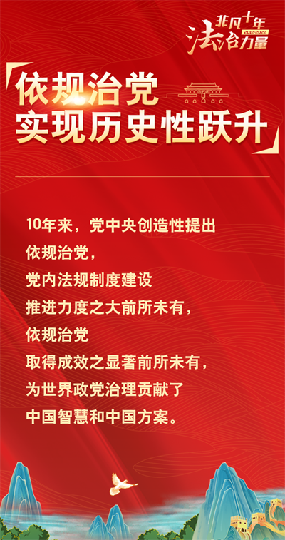 法治網(wǎng)精心策劃制作十期海報(bào),帶您一起領(lǐng)略非凡十年的法治力量!今天為您奉上第九期“依規(guī)治黨實(shí)現(xiàn)歷史性躍升”。